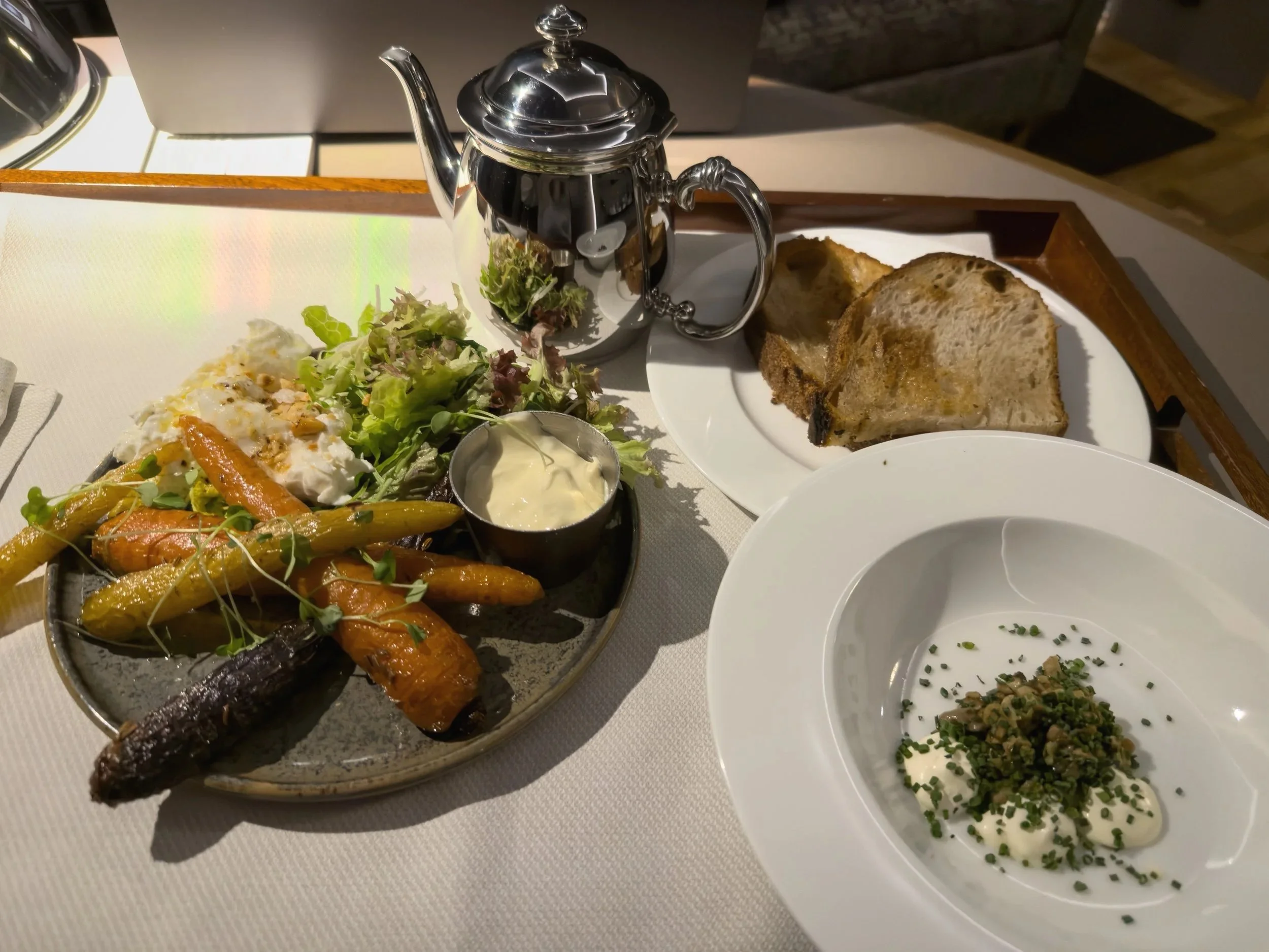 The food at the hotel was really, really good and worth mentioning! I ordered two appetizers: parsnip soup with porcini mushrooms and prosecco cream with toasted sourdough - the soup’s in the teapot, with the porcini and prosecco waiting in the bowl. And roasted carrots with fennel, burrata, and hazelnuts. All fantastic!