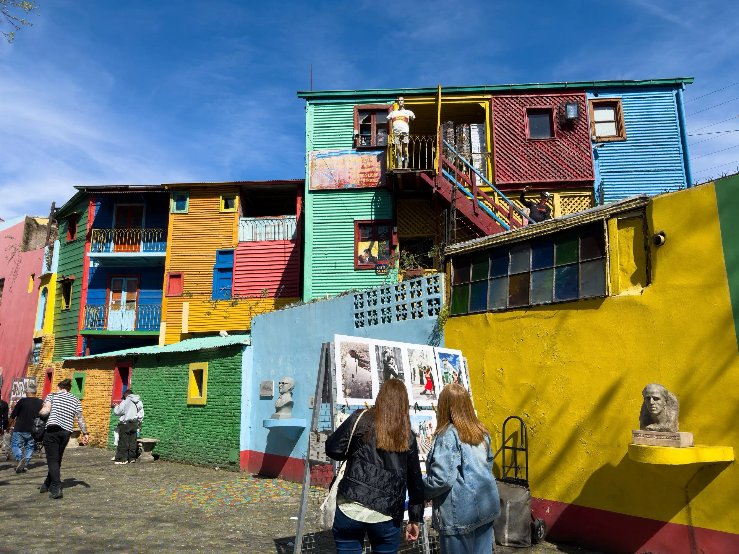 Historically, it’s where the city began, a dockside neighborhood settled by Italian immigrants (mostly from Genoa) in the 19th century. They built homes from leftover ship materials, painting the corrugated metal walls with whatever marine paint was on hand, which is why the place is full of mismatched color. Caminito, the short pedestrian street where we were walking, is lined with those rainbow façades, a kind of open-air art installation originally restored in the 1950s by artist Benito Quinquela Martín to celebrate the neighborhood’s immigrant roots.