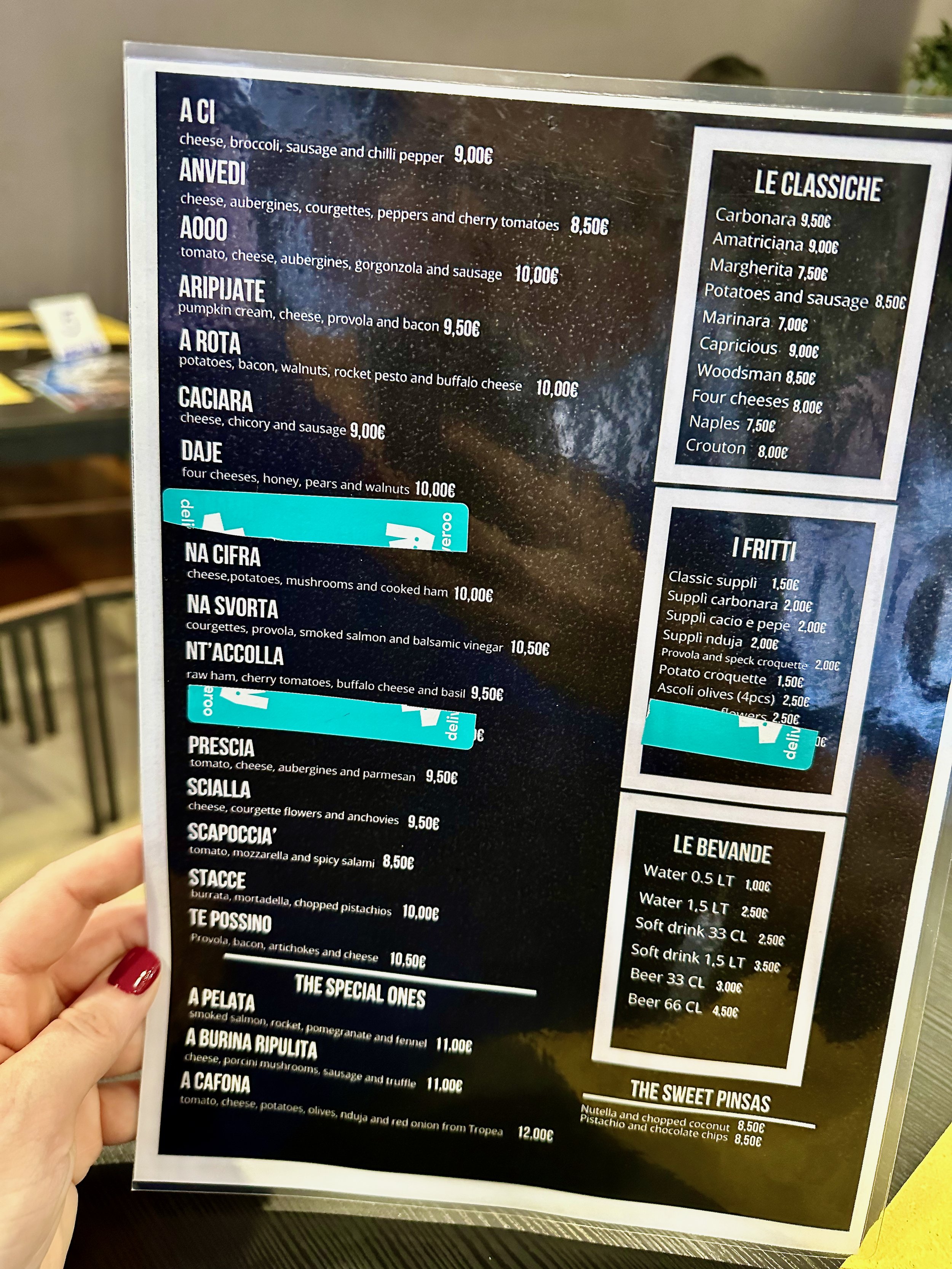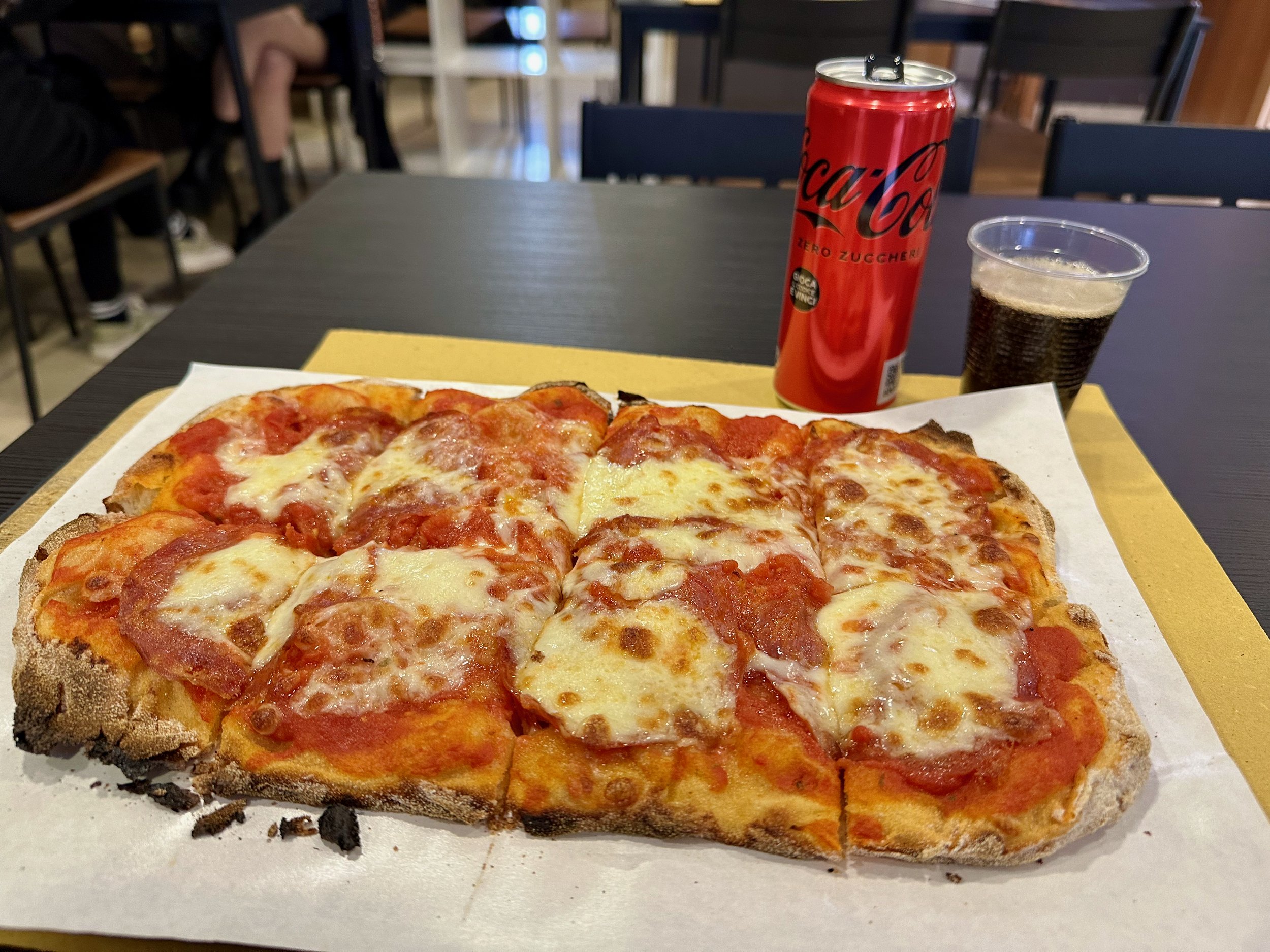 It was the right place, though, which was empty aside from another group of tourists. It was about 6:45, so I wasn’t surprised – Italians eat very late! (If they’d be here at all – tough to tell if locals would eat here or if it was just a tourist stop, though this was the first place I encountered where the woman working there didn’t speak any English, so thinking it might be for everyone.) There were so many choices and I couldn’t make up my mind, so quickly googled some reviews to see if there was one that was recommended a lot, and based on that decided on the Scappocia – tomato, mozzarella, and spicy salami. And the people were right – it was SO good.