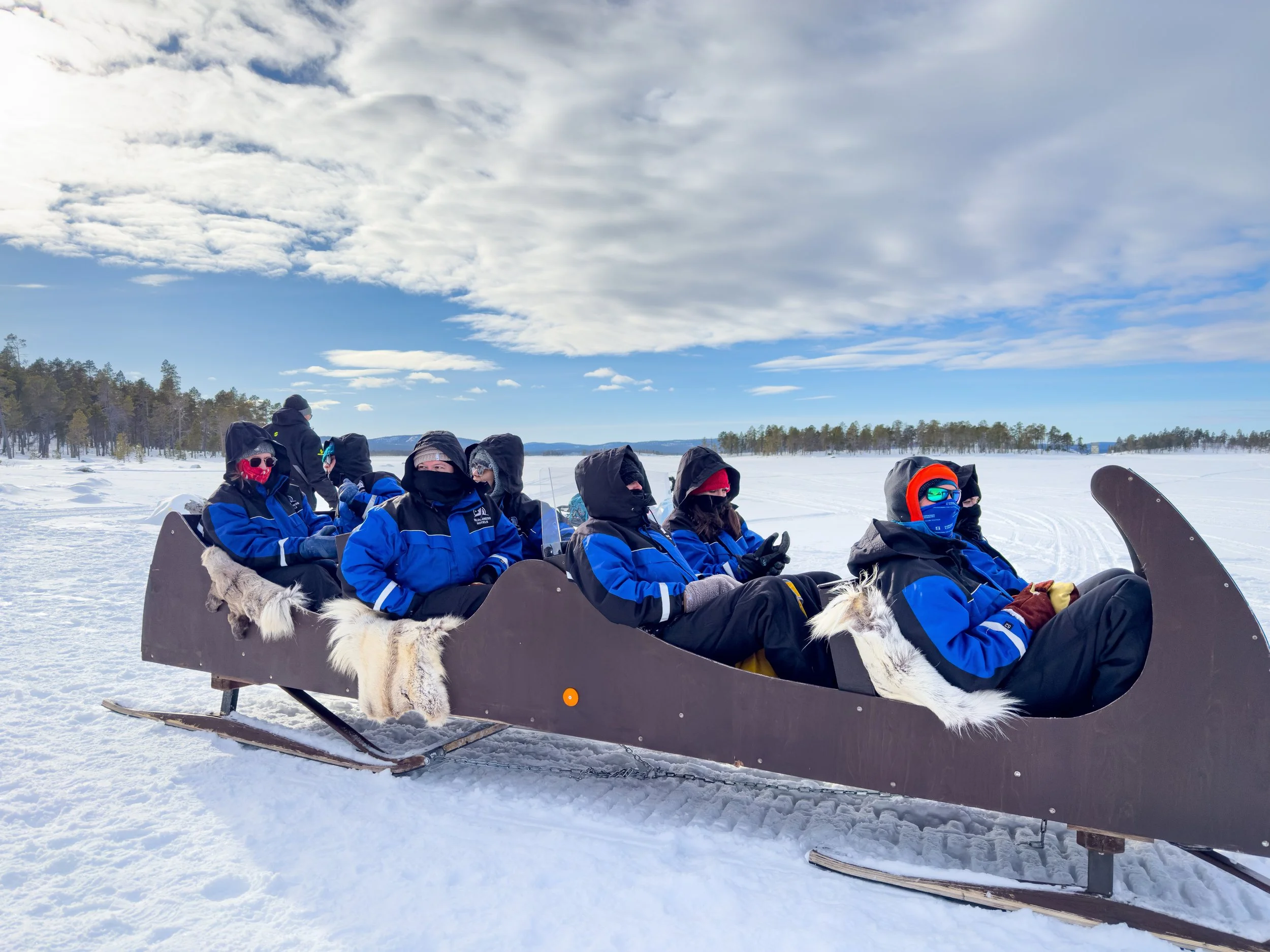 We took the short walk from the Lodge to Lake Inari that we were now getting used to, and hopped into two snowmobile sleighs to head out to the middle of the lake for our fishing excursion.